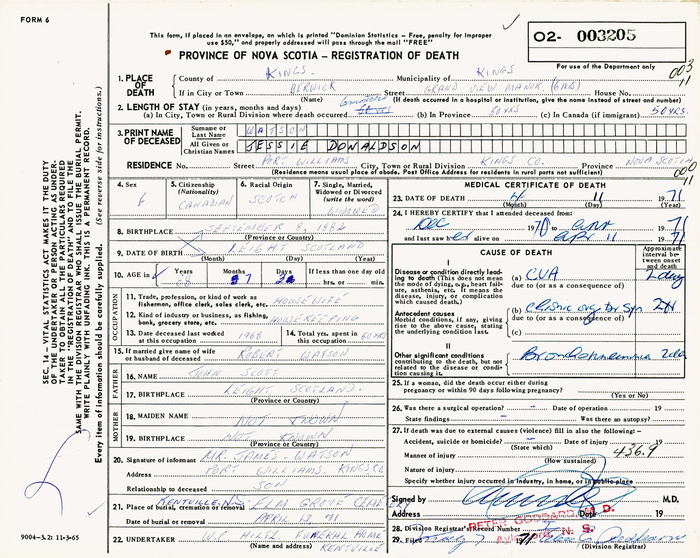 PROVINCE OF NOVA SCOTIA — REGISTRATION OF DEATH