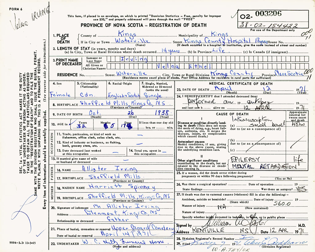 PROVINCE OF NOVA SCOTIA — REGISTRATION OF DEATH