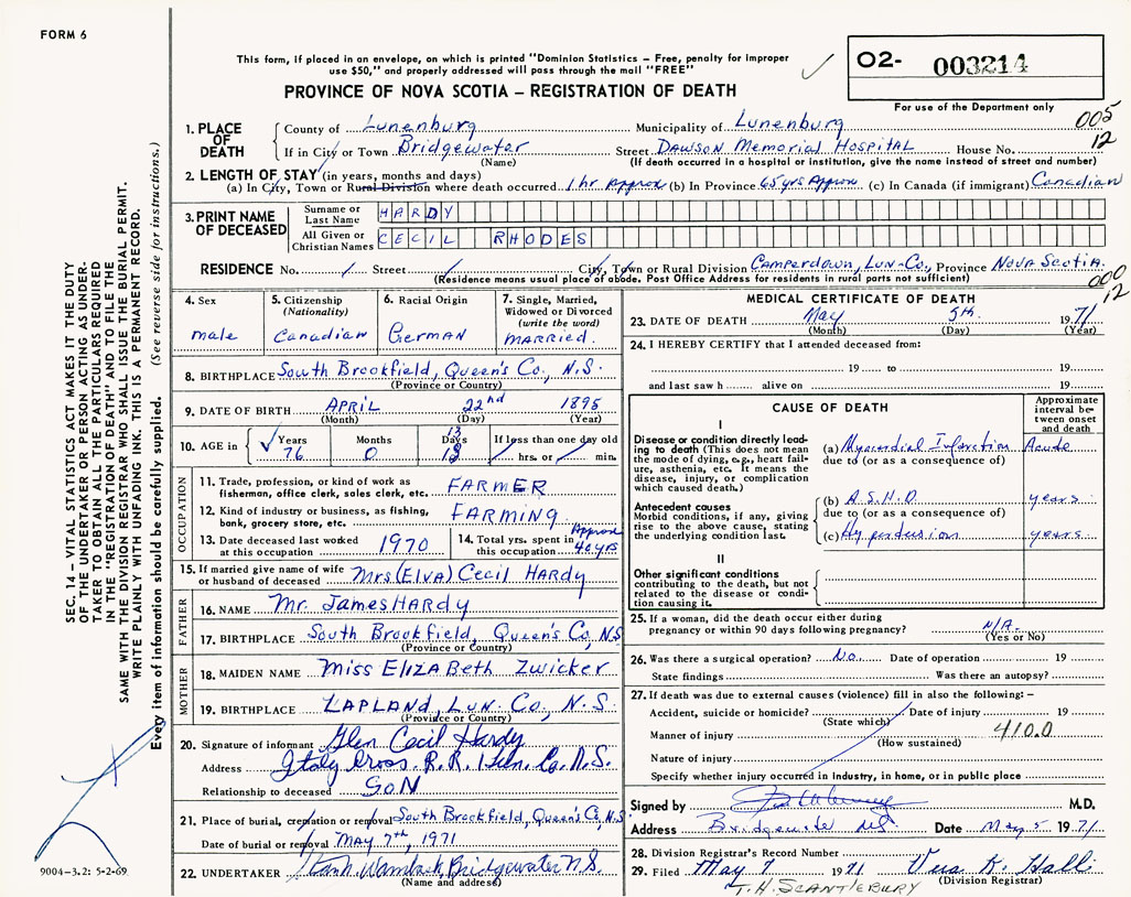 PROVINCE OF NOVA SCOTIA — REGISTRATION OF DEATH