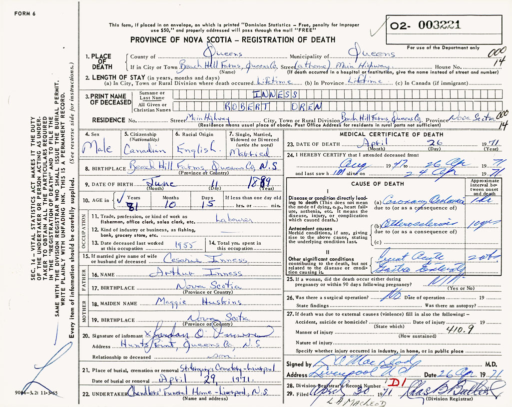 PROVINCE OF NOVA SCOTIA — REGISTRATION OF DEATH