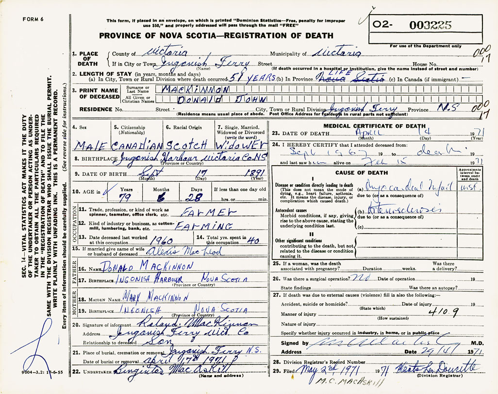 PROVINCE OF NOVA SCOTIA — REGISTRATION OF DEATH