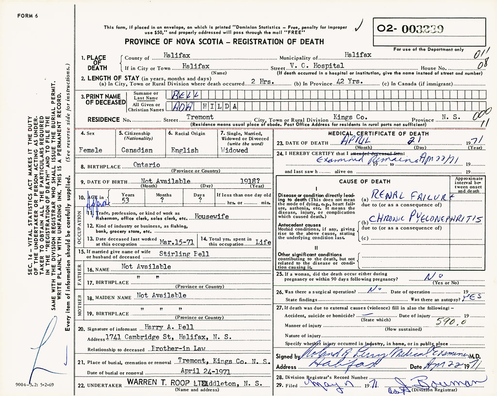 PROVINCE OF NOVA SCOTIA — REGISTRATION OF DEATH