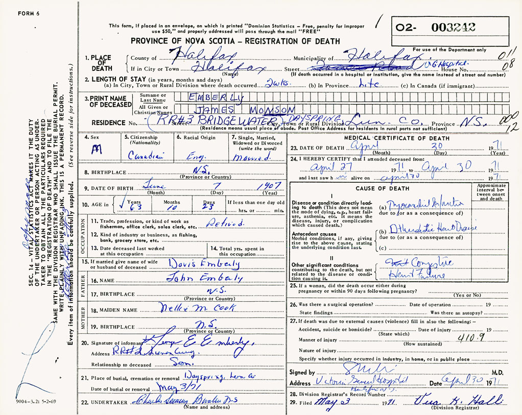 PROVINCE OF NOVA SCOTIA — REGISTRATION OF DEATH