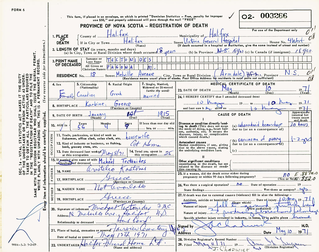 PROVINCE OF NOVA SCOTIA — REGISTRATION OF DEATH