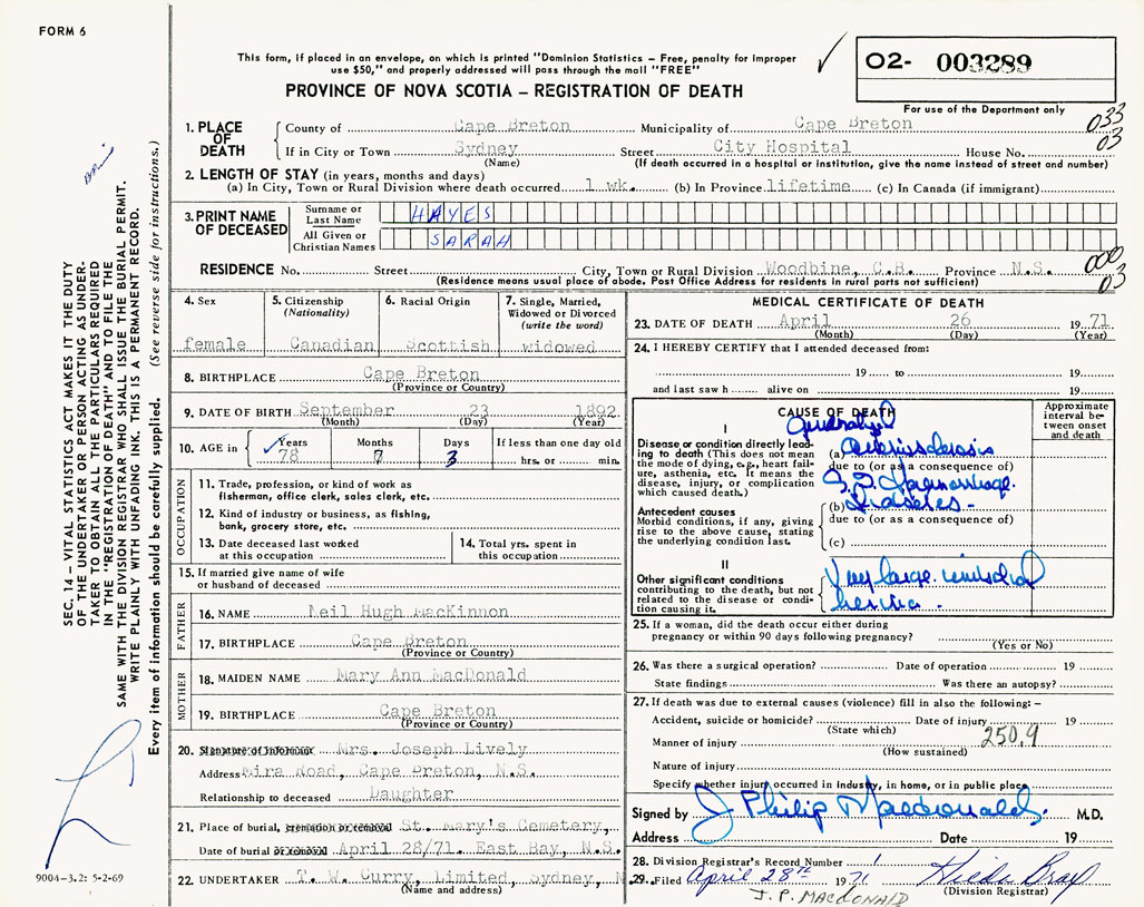 PROVINCE OF NOVA SCOTIA — REGISTRATION OF DEATH