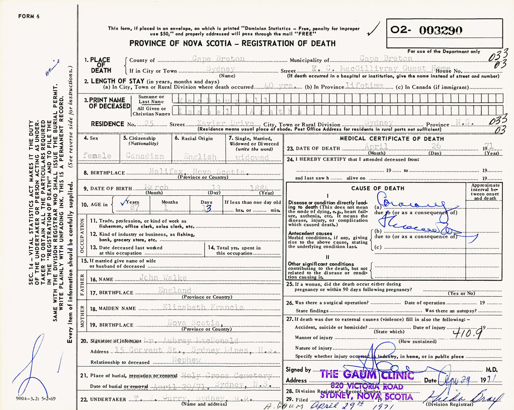 If death occured in a hospital or institution R C MacGillivray Guest Home, Sydney, NS