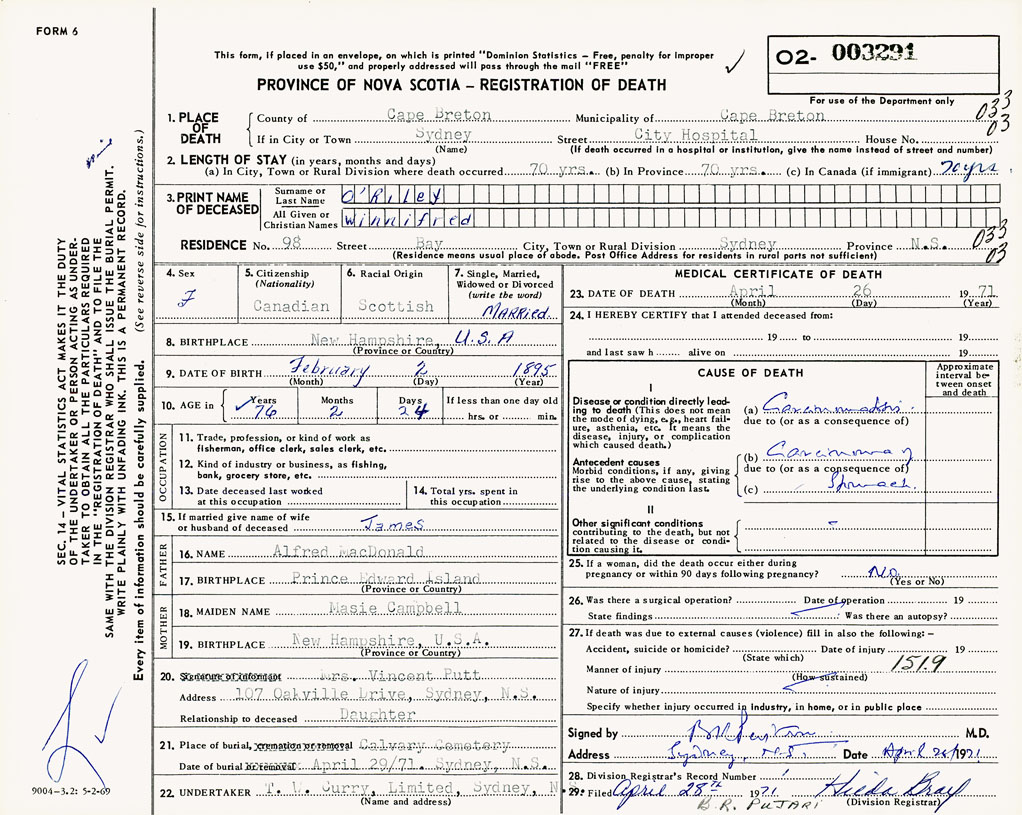 21. Place of burial Calvary Cemetery, Sydney, NS