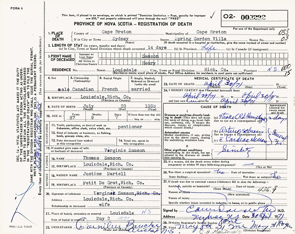 21. Place of burial Louisdale, NS
