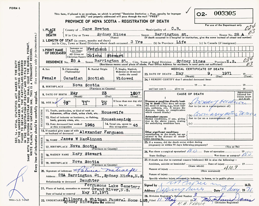 1. PLACE OF DEATH County of Cape Breton If in City or Town Sydney Mines