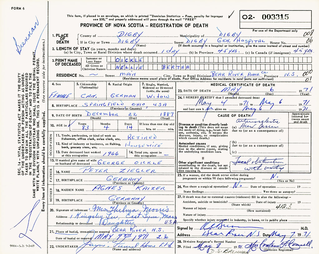 21. Place of burial Bear River, NS