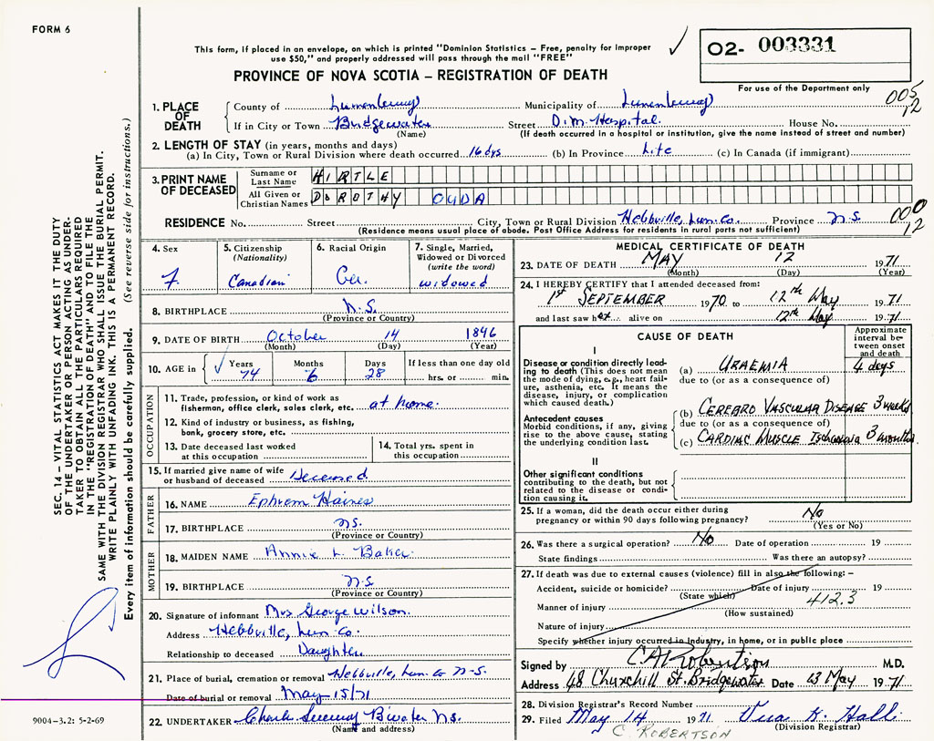 PROVINCE OF NOVA SCOTIA — REGISTRATION OF DEATH