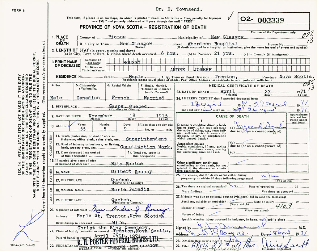 PROVINCE OF NOVA SCOTIA — REGISTRATION OF DEATH