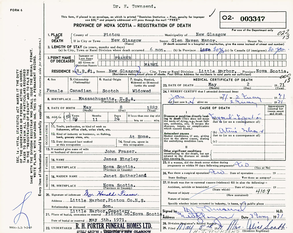 If death occured in a hospital or institution Glen Haven Manor, Pictou, New Glasgow, NS