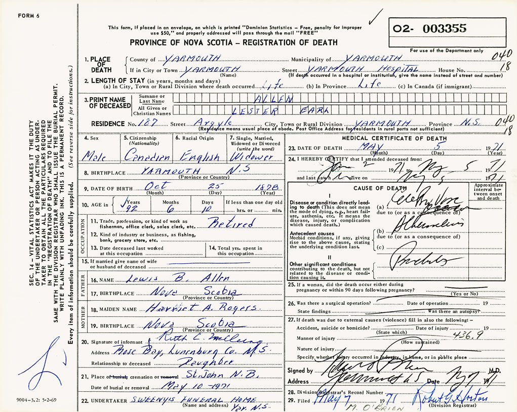 PROVINCE OF NOVA SCOTIA — REGISTRATION OF DEATH