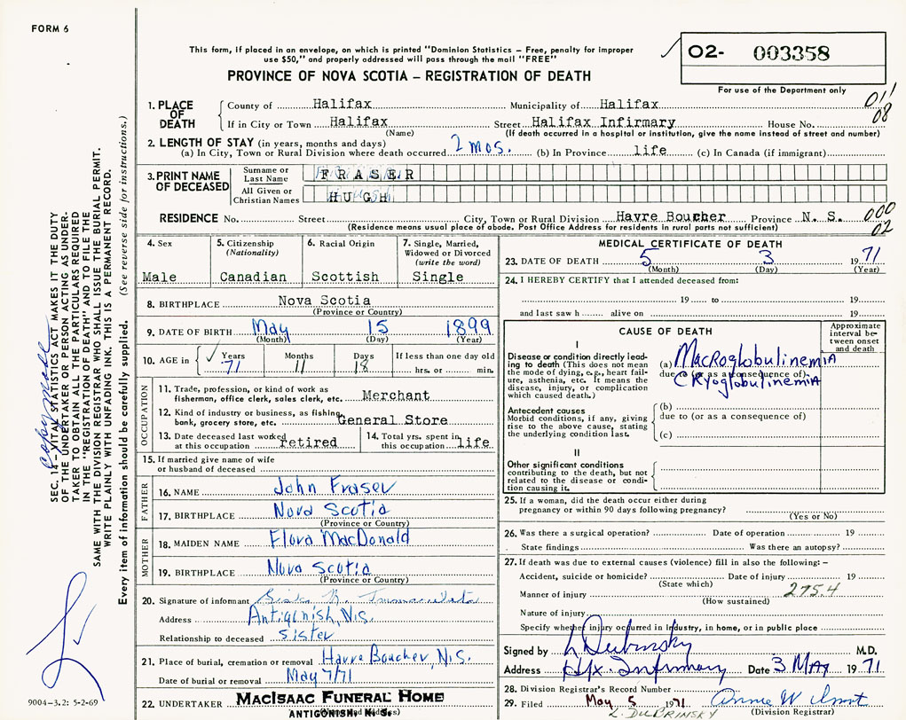 PROVINCE OF NOVA SCOTIA — REGISTRATION OF DEATH