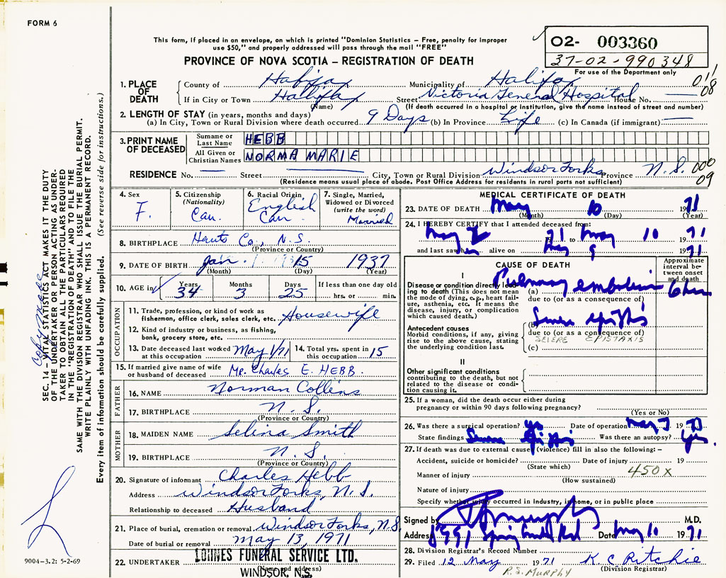 PROVINCE OF NOVA SCOTIA — REGISTRATION OF DEATH