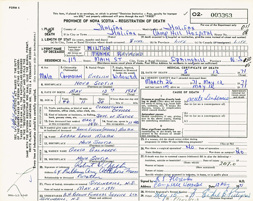 21. Place of burial Springhill, NS