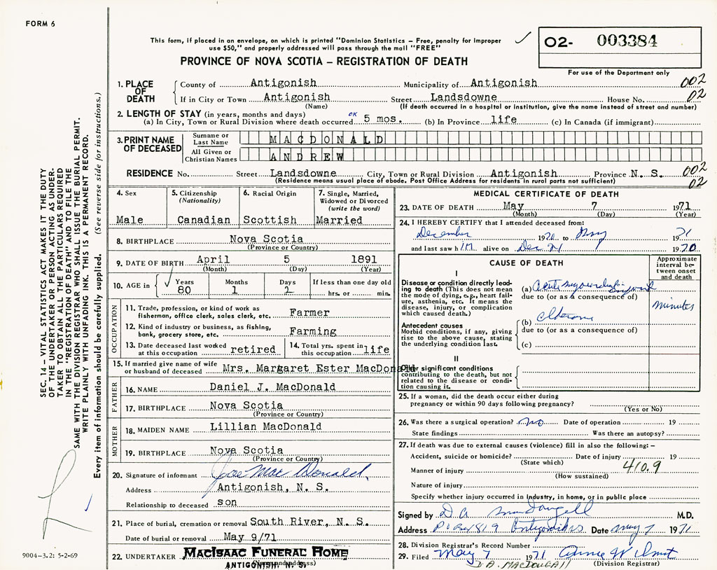 PROVINCE OF NOVA SCOTIA — REGISTRATION OF DEATH