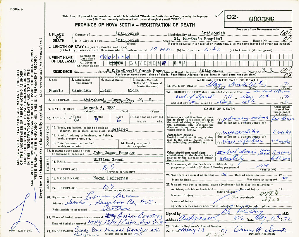 PROVINCE OF NOVA SCOTIA — REGISTRATION OF DEATH
