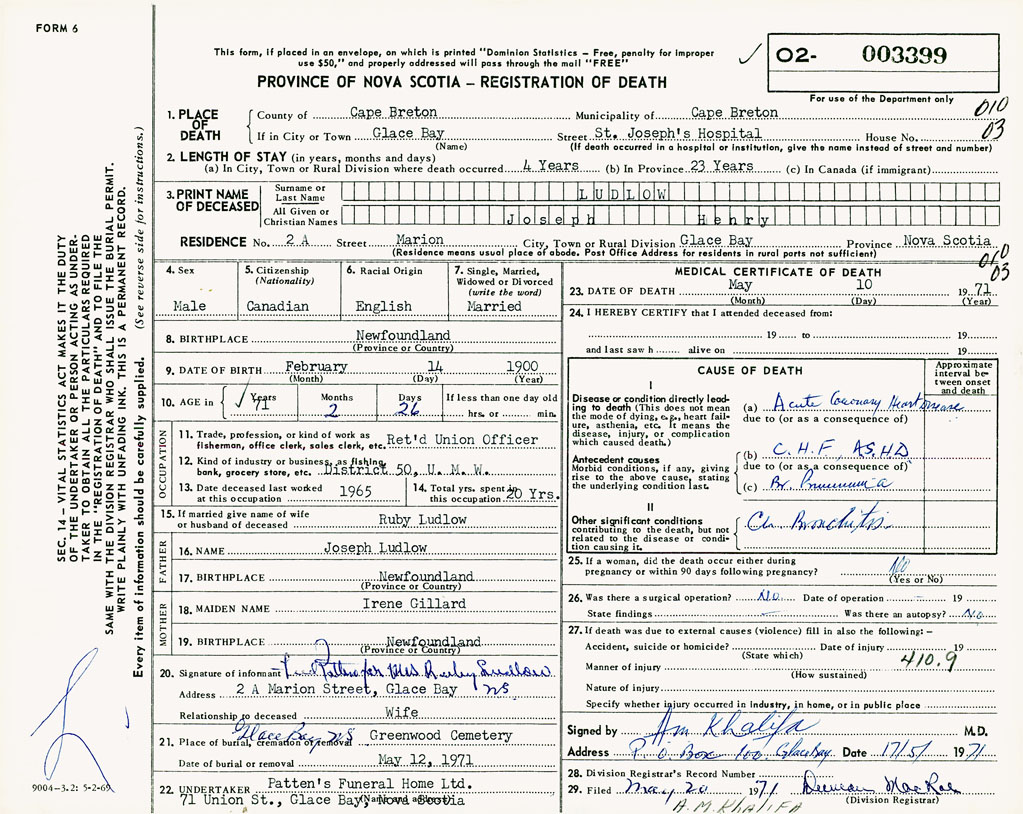 21. Place of burial Greenwood Cemetery, Glace Bay, NS