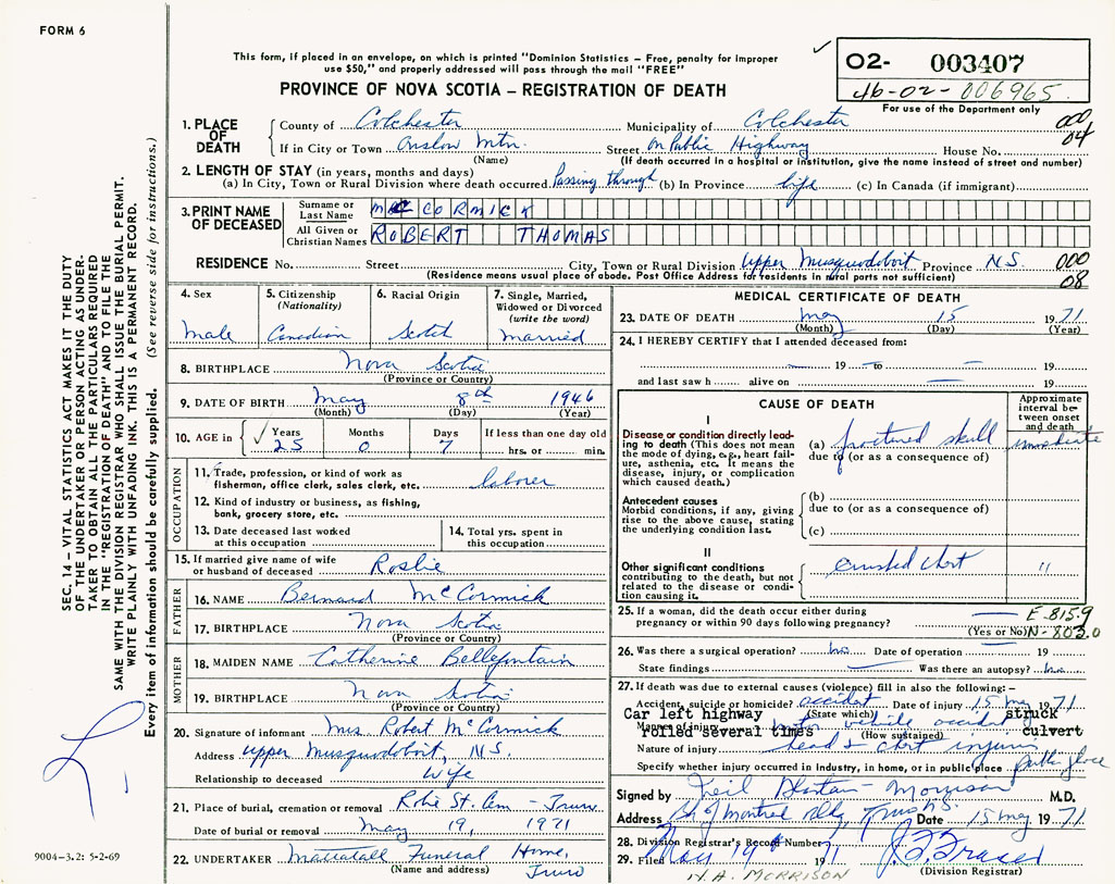 PROVINCE OF NOVA SCOTIA — REGISTRATION OF DEATH