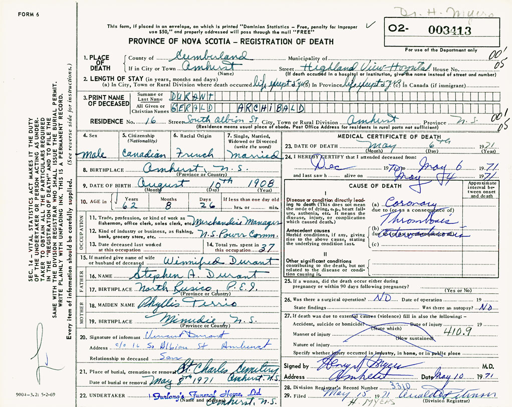 PROVINCE OF NOVA SCOTIA — REGISTRATION OF DEATH
