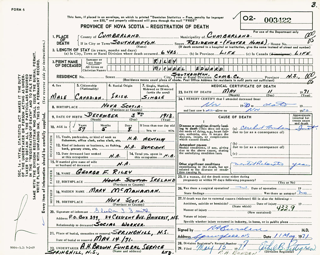 PROVINCE OF NOVA SCOTIA — REGISTRATION OF DEATH