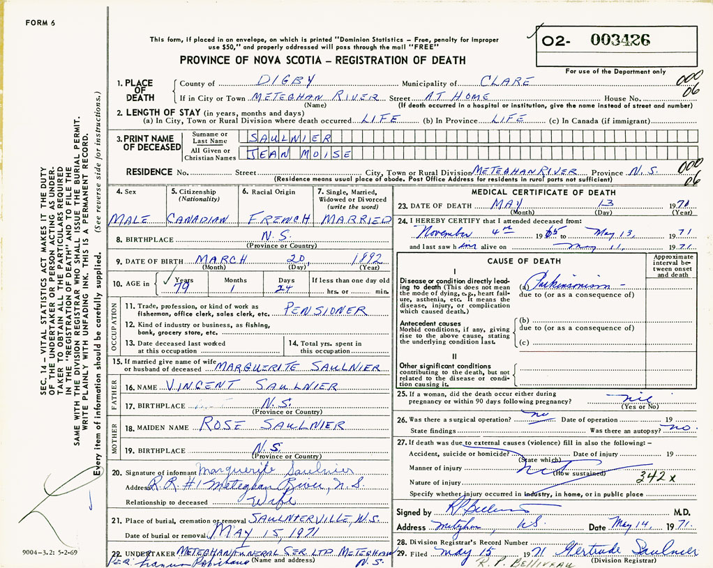 1. PLACE OF DEATH County of Digby If in City or Town Meteghan River