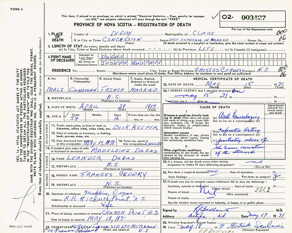 PROVINCE OF NOVA SCOTIA — REGISTRATION OF DEATH
