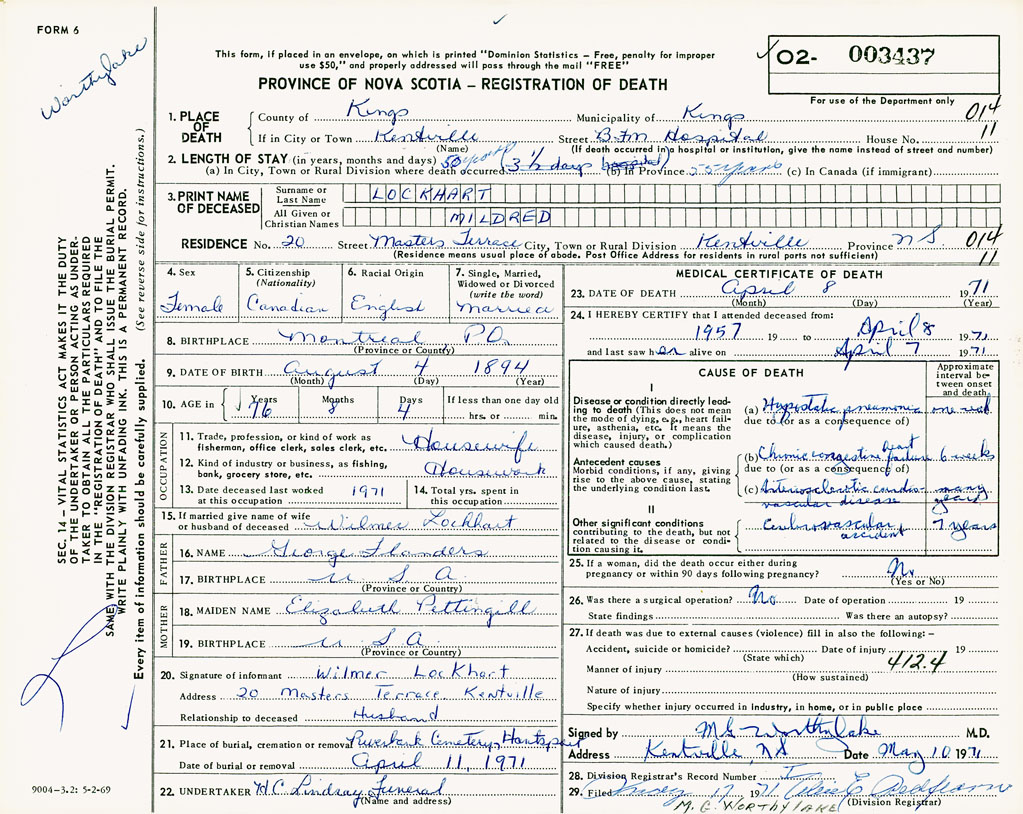 PROVINCE OF NOVA SCOTIA — REGISTRATION OF DEATH