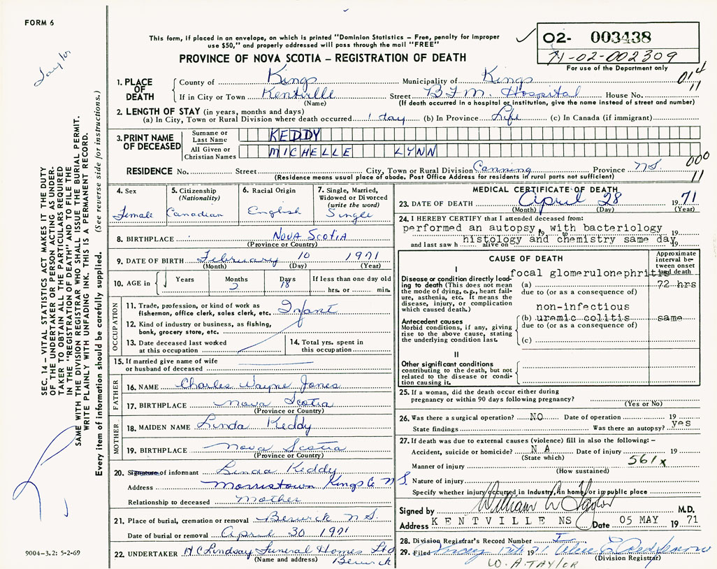 1. PLACE OF DEATH County of Kings If in City or Town Kentville