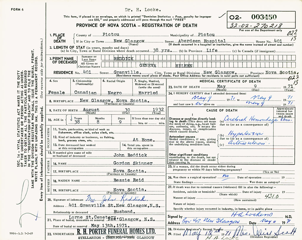 PROVINCE OF NOVA SCOTIA — REGISTRATION OF DEATH