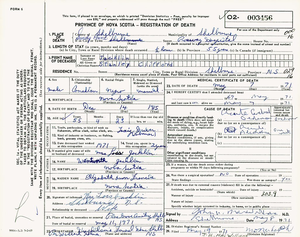 PROVINCE OF NOVA SCOTIA — REGISTRATION OF DEATH