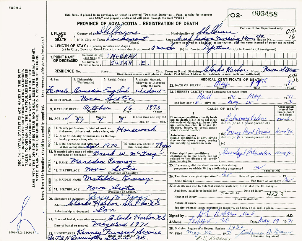 1. PLACE OF DEATH County of Shelburne If in City or Town Lockeport
