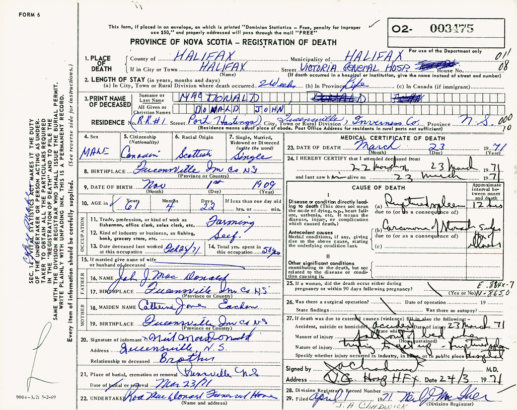 PROVINCE OF NOVA SCOTIA — REGISTRATION OF DEATH