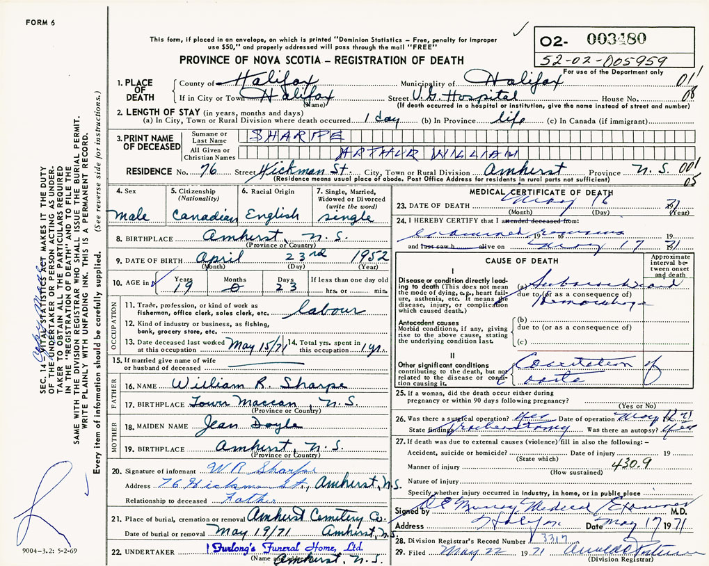 PROVINCE OF NOVA SCOTIA — REGISTRATION OF DEATH