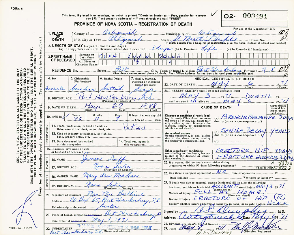 PROVINCE OF NOVA SCOTIA — REGISTRATION OF DEATH