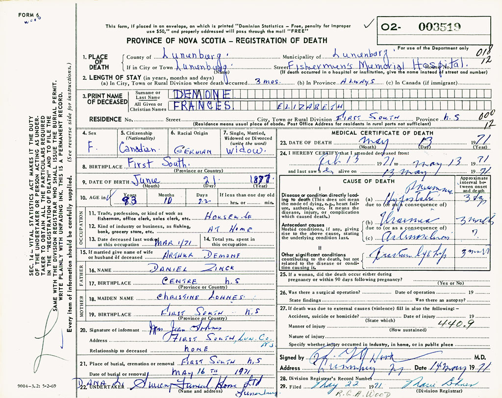 PROVINCE OF NOVA SCOTIA — REGISTRATION OF DEATH