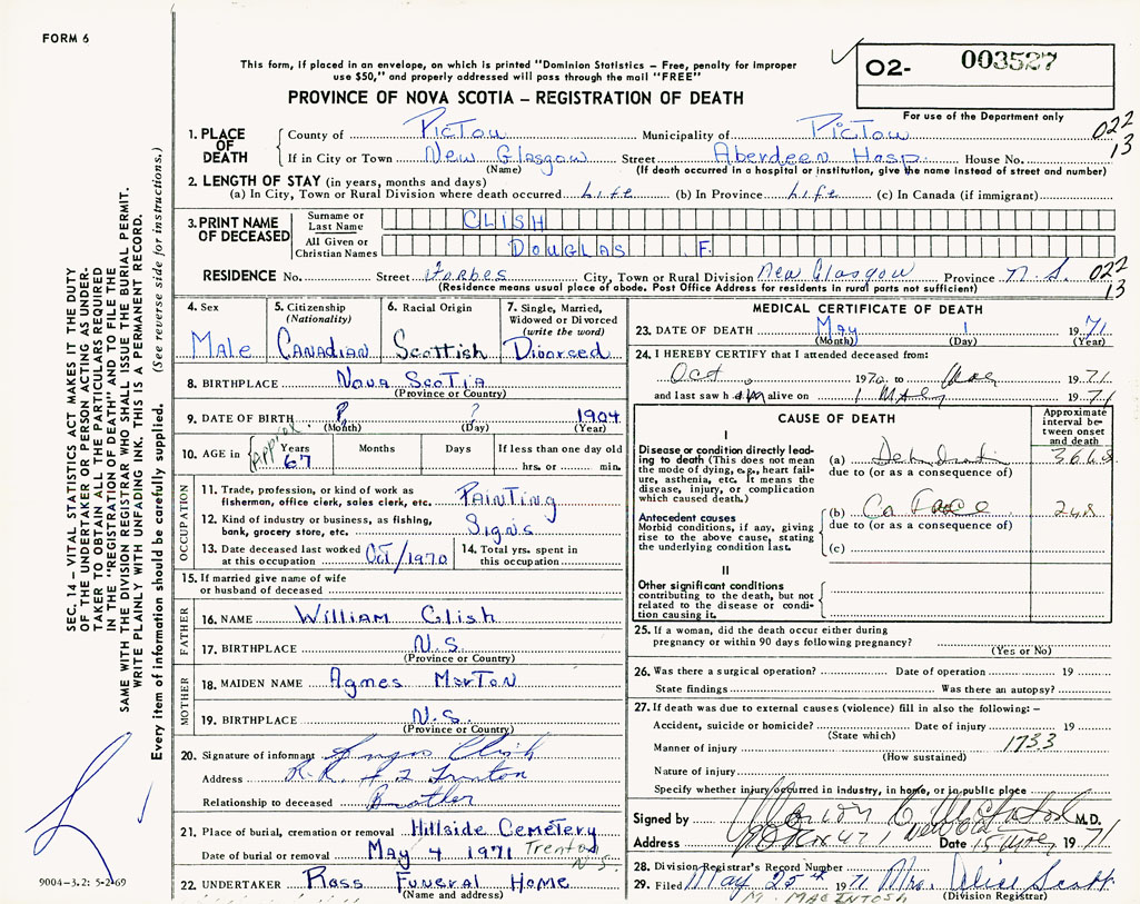 1. PLACE OF DEATH County of Pictou If in City or Town New Glasgow