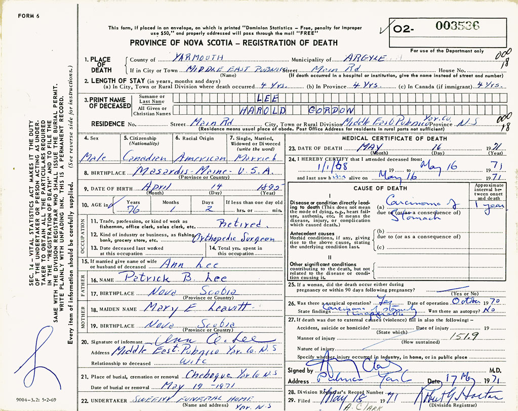 1. PLACE OF DEATH County of Yarmouth If in City or Town Middle East Pubnico