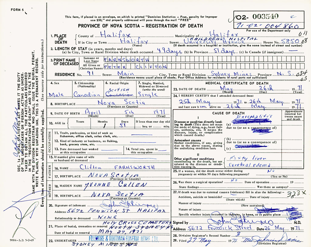 PROVINCE OF NOVA SCOTIA — REGISTRATION OF DEATH