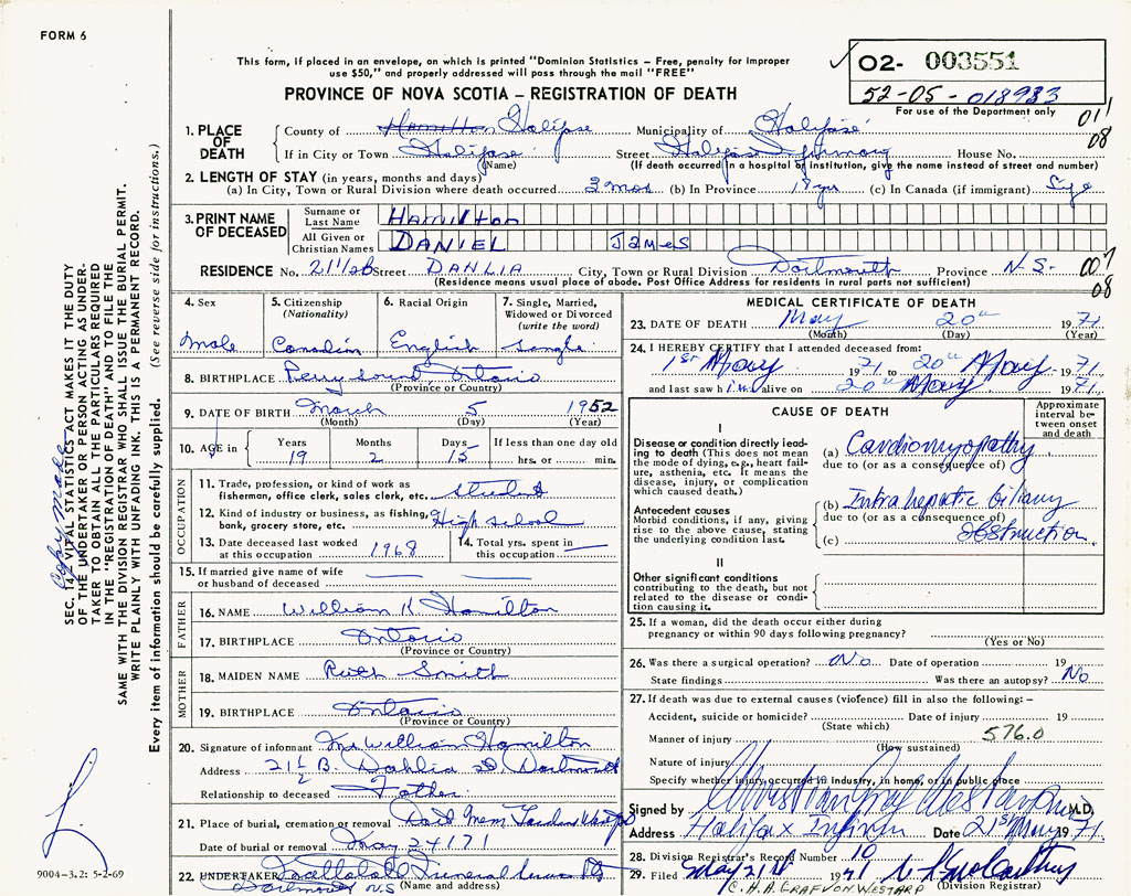 PROVINCE OF NOVA SCOTIA — REGISTRATION OF DEATH