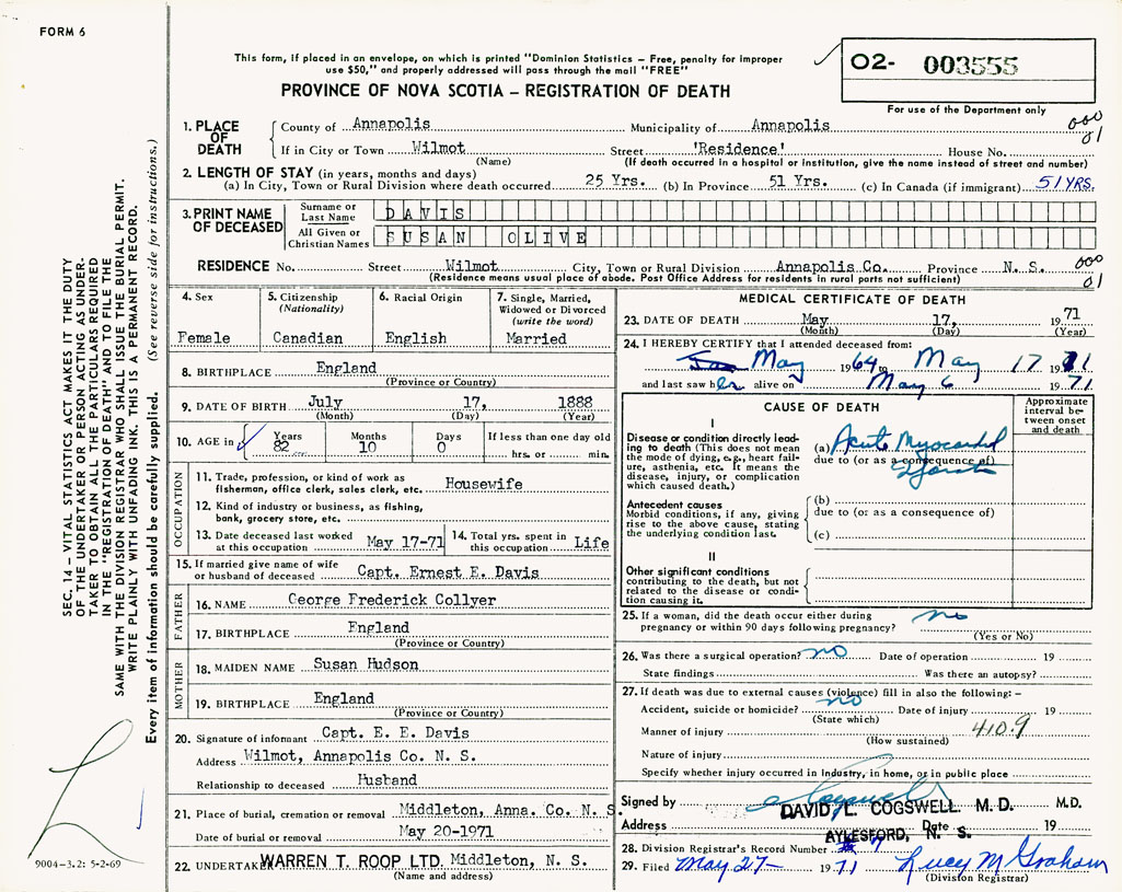 PROVINCE OF NOVA SCOTIA — REGISTRATION OF DEATH