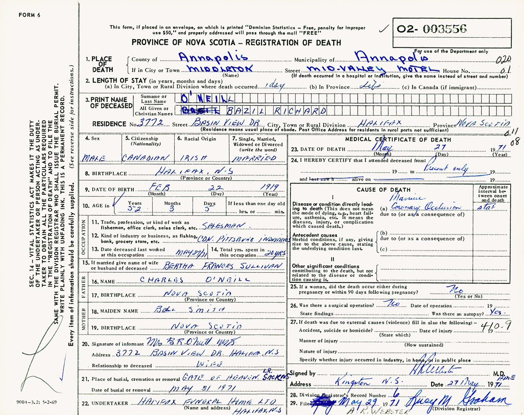 PROVINCE OF NOVA SCOTIA — REGISTRATION OF DEATH