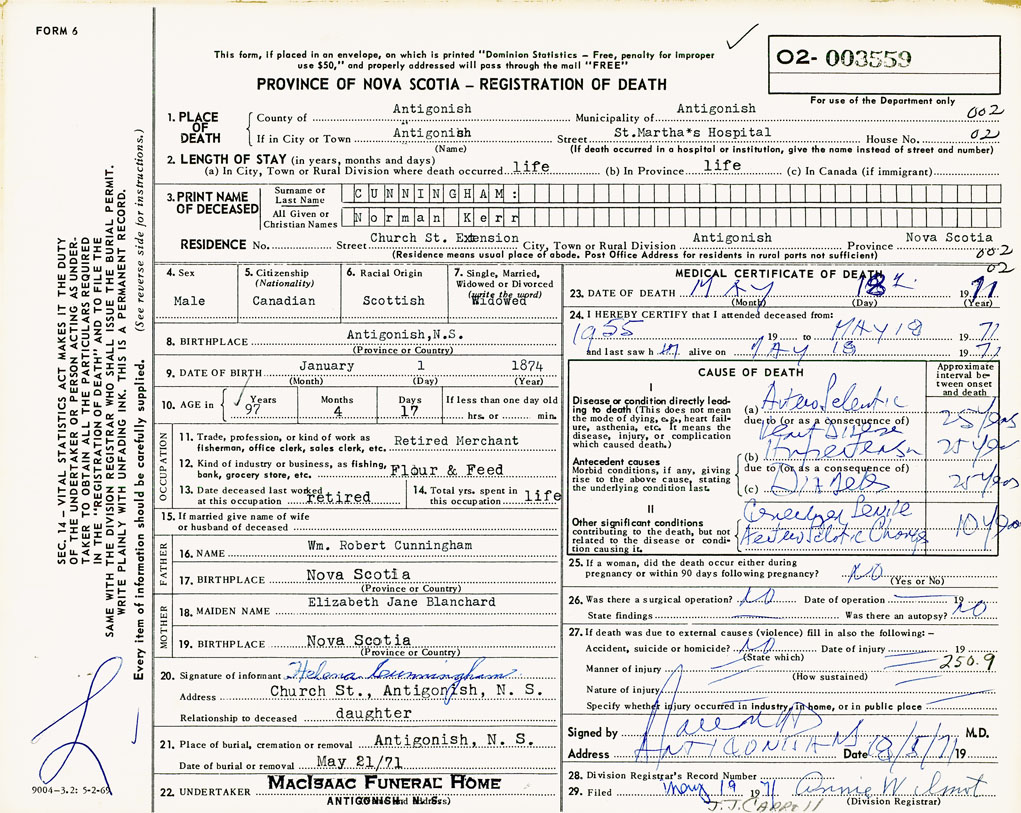 1. PLACE OF DEATH County of Antigonish If in City or Town Antigonish
