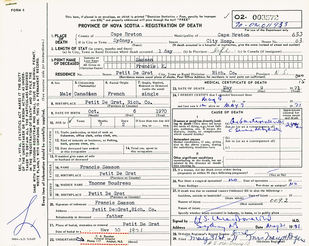 1. PLACE OF DEATH County of Cape Breton If in City or Town Sydney
