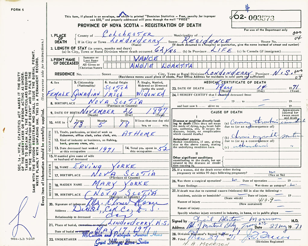 PROVINCE OF NOVA SCOTIA — REGISTRATION OF DEATH