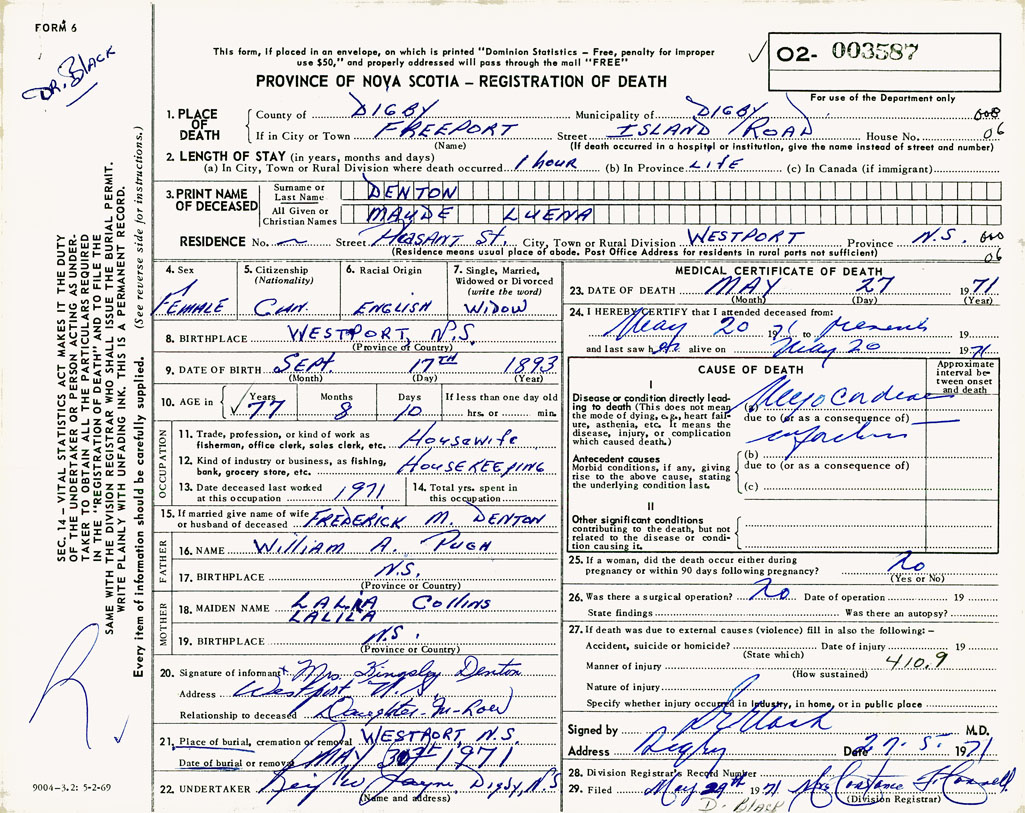 21. Place of burial Westport, NS
