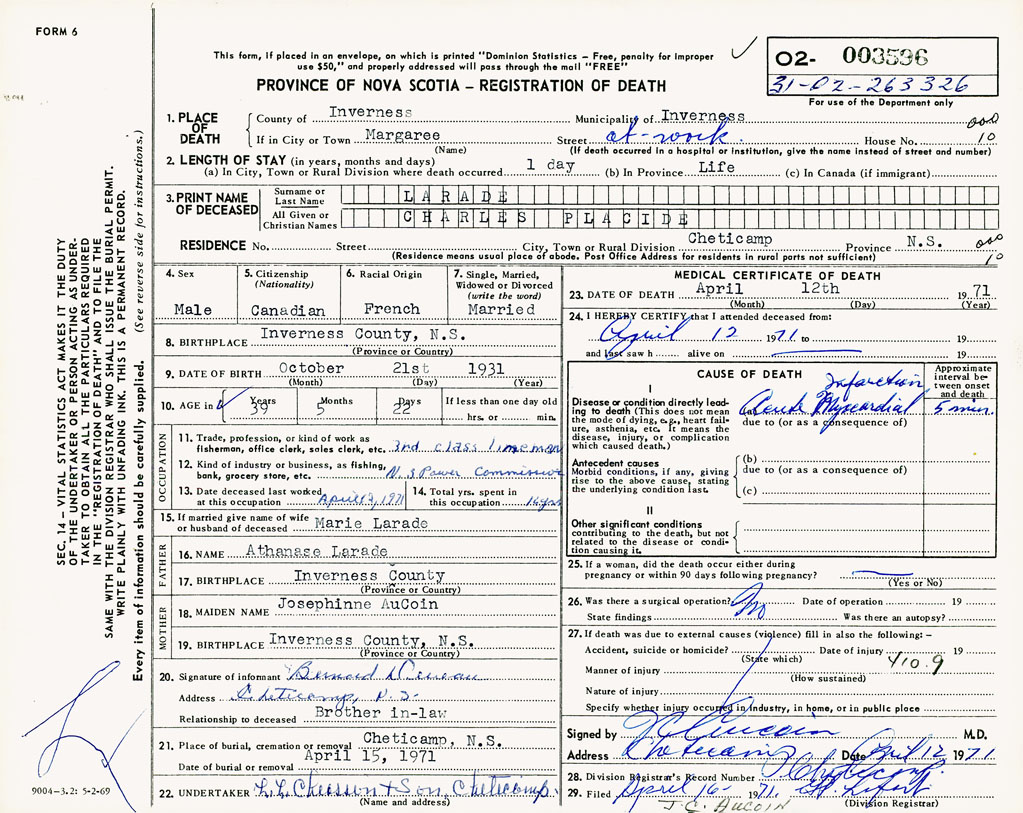 PROVINCE OF NOVA SCOTIA — REGISTRATION OF DEATH