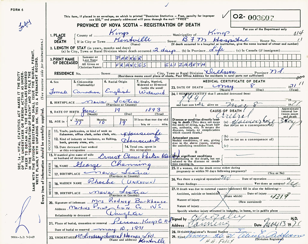 1. PLACE OF DEATH County of Kings If in City or Town Kentville